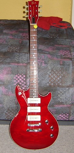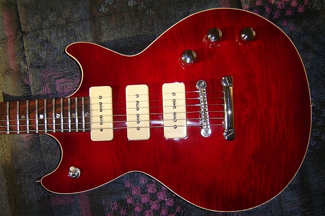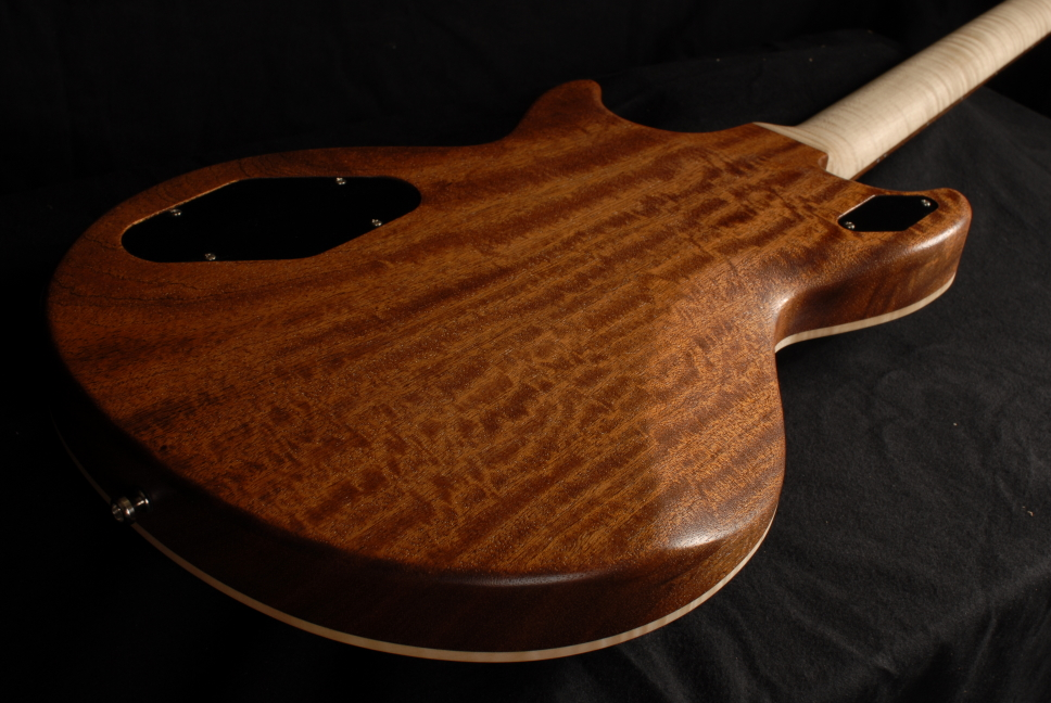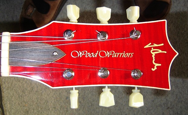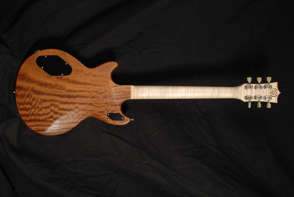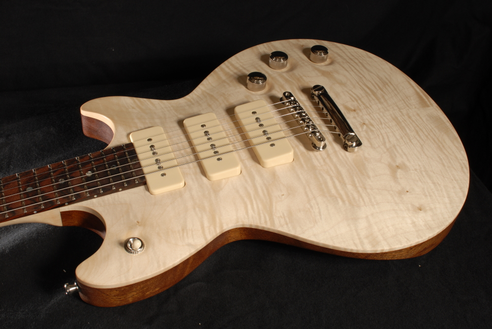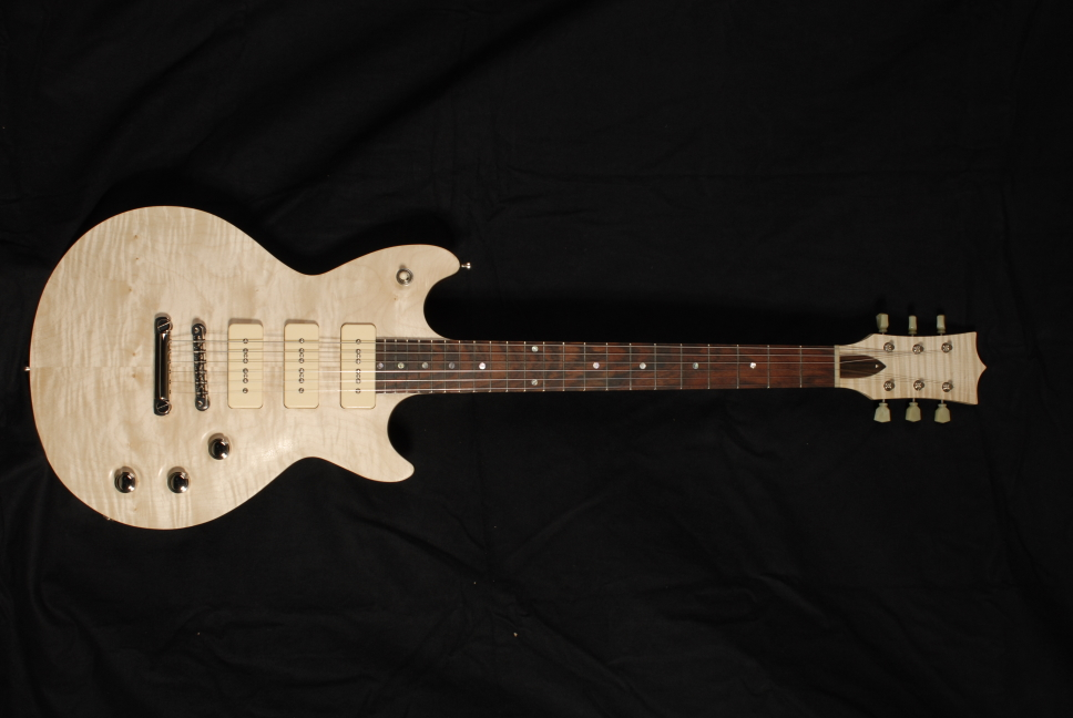 Body: Sipo, einteilig Decke: Maple, gewölbt Hals: Maple PUs: P90, selbstgewickelt, der mittlere ist dynamisch zuregelbar. Dadurch lassen sich in den beiden Mittelpositionen Strat-artige Klänge erzeugen. Sound: geil! Im Moment ist nur eine Grundierung drauf, die Gitarre wird noch lackiert, in den Headstock kommt noch der Wood-Warriors-Schriftzug.
